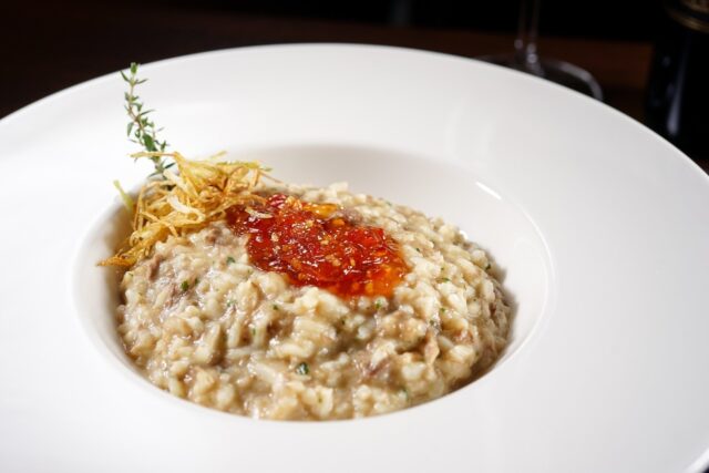 Arroz carnaroli, alho, cebola, tomilho, salsa, pernil de cordeiro desfiado, queijo parmesão, manteiga e geleia de pimenta agridoce.
