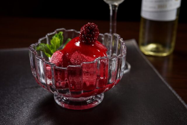 Taça de sorbet de frutas vermelhas com calda de frutas vermelhas. Não contém lactose.