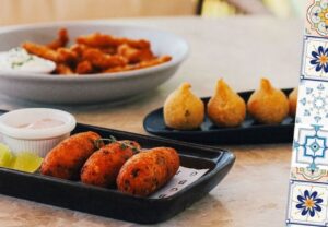 Bolinho de bacalhau a la Canastra (releitura do bolinho de bacalhau recheado com queijo canastra). Seis unidades servem duas pessoas ao valor de R$49,00.