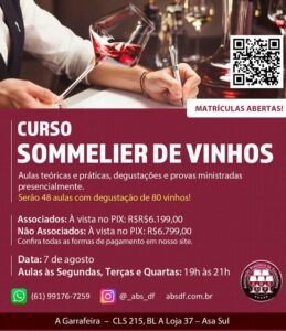 Abre as inscrições para o renomado Curso de Sommelier de Vinhos da ABS-DF que começa em agosto. Venha se matricular!
