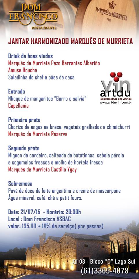Marqués de Murrieta e Art du Vin – Na terça-feira (21.07), às 20h30min, será realizado o Jantar Harmonizado Marqués de Murrieta, com o enólogo da vinícola João Machete Pereira. Os vinhos espanhóis são importados pela Art du Vin. O jantar assinado pelo chef Francisco Ansiliero terá um custo de R$ 195,00, mais taxa de 10% de serviço. Para dar as boas-vindas aos clientes, a saladinha do chef e os pães da casa vão acompanhar o Marqués de Murrieta Pazo Barrantes Albariño Amuse Bouche. Como entrada, o nhoque de mangaritos a burro e sálvia será servido com o Capellania. O primeiro prato, chorizo de angus na brasa com vegetais grelhados e chimichurri vai vir acompanhado do Marqués de Murrieta Reserva. Já O mignon de cordeiro, salteado de batatinhas, cebola pérola e cogumelos frescos com molho de hortelã fresca, segundo prato, será servido com o Marqués de Murrieta Castillo Ygay. A sobremesa, o doce de leite argentino e creme de mascarpone fecham a noite com sucesso. Como complemento, água mineral, chá, café e petit fours. As reservas antecipadas podem ser realizadas pelo telefone (61) 3365 4078.
