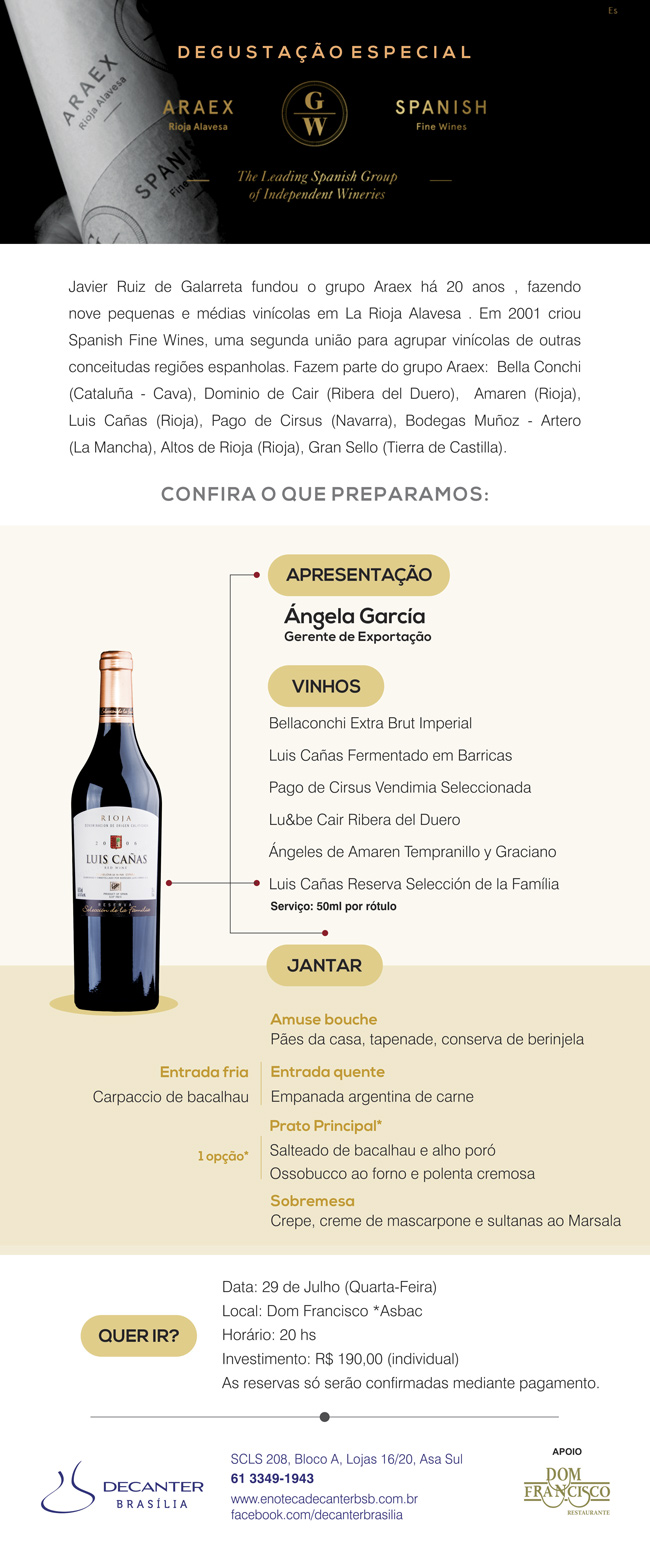 Araex e Decanter – Já na quarta-feira (29.07), às 20h, a gerente de exportação do grupo Araex, Angela Garcia, irá apresentar o sabor da Espanha com rótulos especiais importados pela Enoteca Decanter. O jantar por pessoa sairá por R$190,00. Os vinhos da noite serão: Bellaconchi Extra Brut Imperial, Luis Cañas Fermentado em Barricas, Pago de Cirsus Vendimia Seleccionada, Lu&be Cair Ribera del Duero, Ángeles de Amaren Tempranillo y Graciano e Finca Muñoz Cepas Viejas.