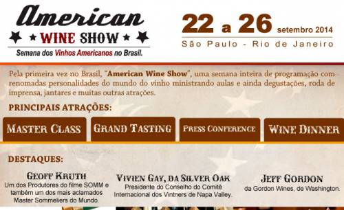 O primeiro e maior evento devinhos americanos já realizado no Brasil: o “American Wine Show”. Renomadas personalidades mundiais irão ministrar aulas e participar de degustações, jantares e outros eventos, entre os dias 22 e 26 de setembro, com o objetivo de apresentar aos brasileiros o maior e melhor portfólio de vinhos americanos. Entre as atrações está confirmada a presença  de um dos mais aclamados Master Sommelier do MundoGeoff Kruth, que irá ministrar aulas em algumas das melhores escolas de vinhos do Brasil como a ABS de São Paulo, o Senac, aEnocultura e a ABS do Rio de Janeiro. Kruth também será a principal atração do Master Class, que acontecerá no Caesar Business Park, em São Paulo, no dia 24 de setembro.