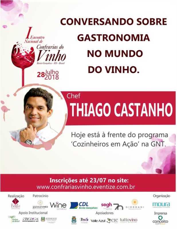 Depois do vinho, será a vez do chef Thiago Castanho temperar o encontro com uma palestra focada em gastronomia. Apresentador do reality Cozinheiros em Ação, da GNT, é titular do premiado Remanso do Bosque, em Belém, que junto com o Remanso do Peixe, foi eleito três vezes chef do ano pela edição Veja Comer & Beber Belém. Paraense, é inspirado na culinária tradicional amazônica e sua especialidade são os peixes assados na brasa. Hoje, é considerado um dos chefs mais inovadores do Brasil. Ao final, Dardeau e Castanho participarão de um bate papo mediado pela mestre em Turismo e presidente da Associação Internacional de Enoturismo (Aenotur), Ivane Fávero, e pelo chef Rodrigo Bellora, líder do movimento Slow Food Primeira Colônia Italiana.