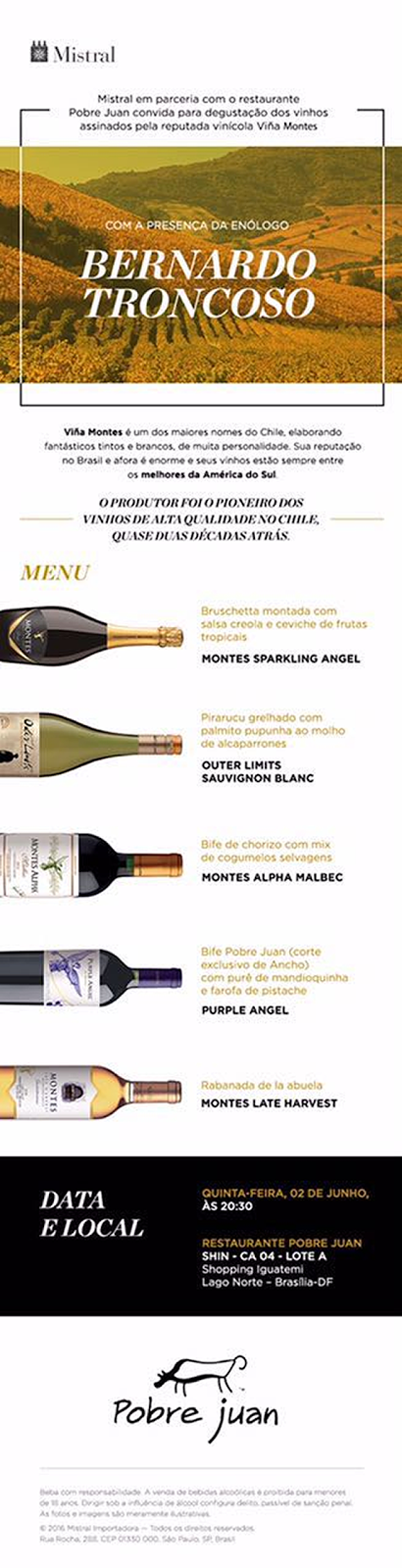 Não perca amanhã (02.06) no restaurante Pobre Juan (Shopping Iguatemi) o jantar harmonizado com vinhos da Viña Montes, um dos maiores nomes do Chile quando o assunto é vitivinicultura. O evento, organizado pela Mistral Importadora, contará com a presença do enólogo chileno Bernardo Troncoso que apresentará alguns dos fantásticos vinhos brancos e tintos produzido pela renomada vinícola chilena. Vale lembrar que os vinhos da Viña Montes são reconhecidos internacionalmente e estão sempre entre os melhores da América do Sul. O convite está sendo vendido no próprio restaurante Pobre Juan a R$250,00 por pessoa. Interessados devem ligar para 3577-5800 e falar com Rodrigo