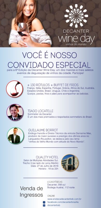 No dia 27 de julho ocorrerá a 6º edição do Decanter Wine Day, em Brasília, e o tema escolhido para este ano foi Vinhos do Mundo! Isso porque vai ser possível degustar 130 rótulos de 15 países diferentes, tanto do Velho como do Novo Mundo, incluindo Itália, França, Portugal, Grécia, Espanha, África do Sul, Austrália, Estados Unidos, Argentina, Chile, Uruguai e Brasil. O evento mais uma vez acontece no Quality Hotel (em frente ao Park Shopping). Além dos vinhos, o público também contará com um buffet de antepastos, frios, queijos e pães.