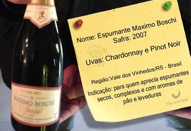 Em visita ao Vale dos Vinhedos, em agosto deste ano, tive a oportunidade de degustar o espumante Maximo Boschi Speciale Extra Brut 2007. Fiquei impressionada com