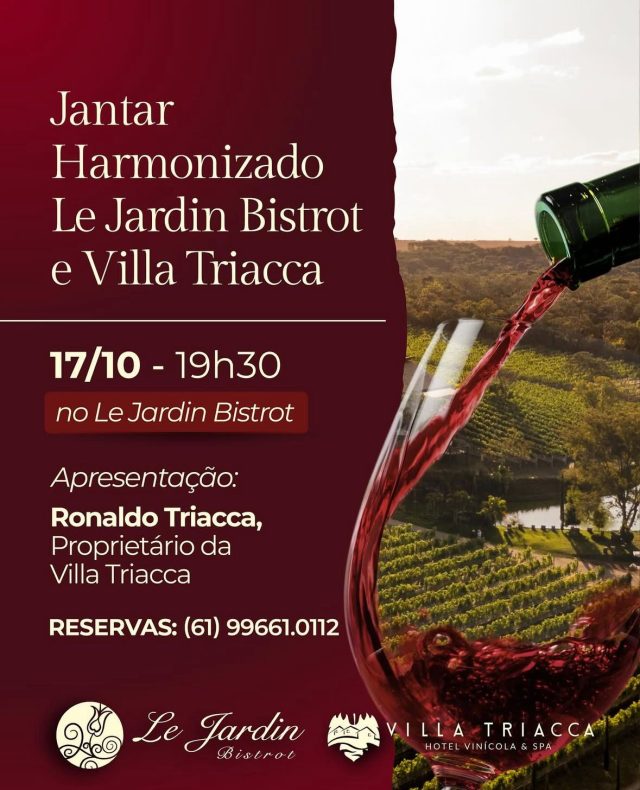 Uma noite especial com vinhos premiados da Villa Triacca e gastronomia autoral No próximo dia 17 de outubro, às 19h30, o Le Jardin Bistrot recebe uma noite dedicada à gastronomia e aos vinhos da Villa Triacca. O evento contará com a presença de Ronaldo Triacca, proprietário da vinícola, que apresentará rótulos premiados da mais nova […]