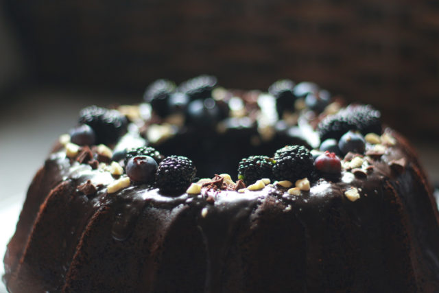 Voltando à massa, junte também 240g de farinha de trigo peneirada e bata até obter uma textura lisa. Por fim, adicione 2 colheres de sopa de cacau em pó, 130g de chocolate meio amargo ralado e especiarias, como uma pitada de noz-moscada ou canela em pó, mexendo tudo à mão. Não se esqueça do fermento em pó, colocando sempre por último e mexendo levemente. Asse em uma forma média por aproximadamente uma hora a 170-180 graus.