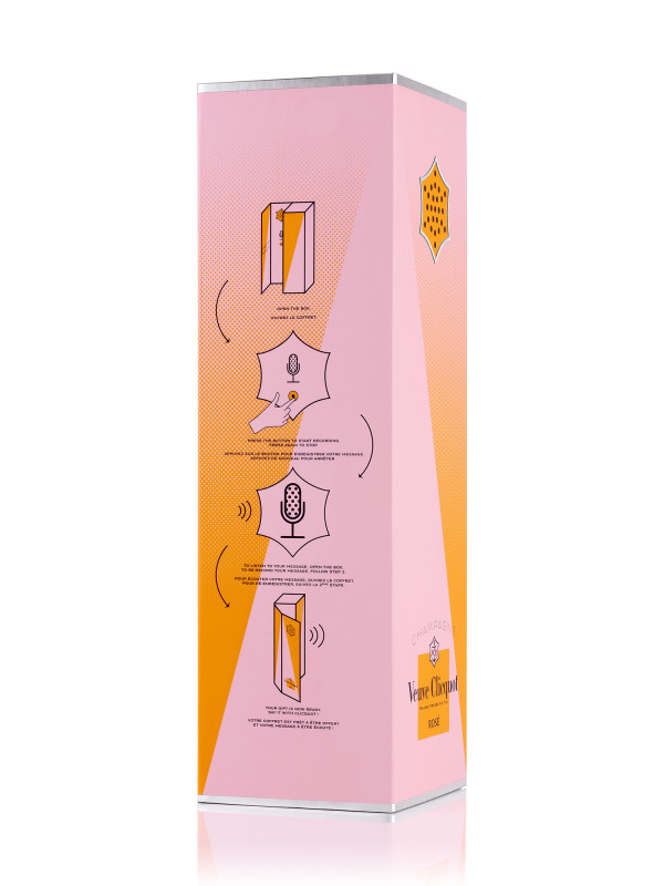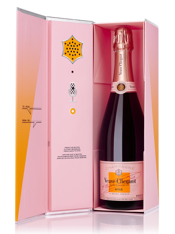 Esta linda caixa, com uma garrafa do champagne Veuve Clicquot Rosé, acompanhada de um gravador embutido, torna-se um presente mais que criativo, um presente surpreendente.