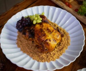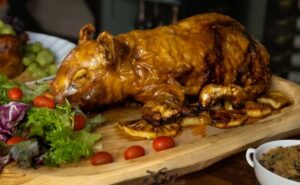Dentre os destaques do cardápio, as entradas apresentam opções como Bolinho de Bacalhau, Bolinho de Brisket Defumado e a Tábua de Frios da Charcutaria Boechat. As proteínas assadas incluem Pernil de cordeiro, Lombo Suíno Recheado, Leitão inteiro, Chester Recheado com Farofa, entre outras opções.