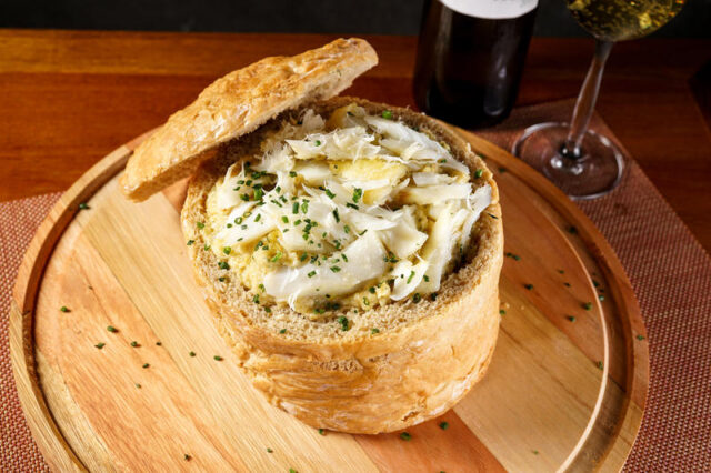 TABERNA LUSITANA – Quem tem planos de desfrutar de um almoço fora de casa com a matriarca, pode apostar na famosa Açorda do Taberna Lusitana, preparo servido dentro do pão, que pode ser feito com bacalhau ou mariscos, de acordo com a escolha do cliente. A porção serve bem 3 pessoas e custa R$ 295.