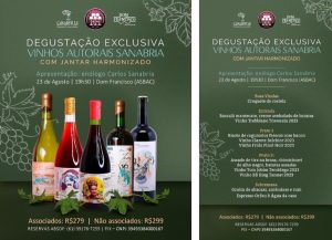 Uma degustação exclusiva dos “Vinhos Autorais Sanabria” com um jantar harmonizado, que ocorrerá no dia 23 de agosto, às 19h30, no restaurante Dom Francisco (ASBAC). A apresentação será conduzida pelo enólogo Carlos Sanabria, responsável pela criação dos vinhos que serão degustados.