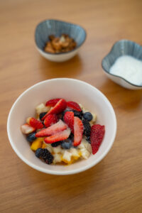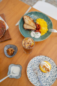 - Desayuno: uma salada de frutas com iogurte e granola da casa, uma fatia de bolo do dia, ovos mexidos cremosos e café coado.