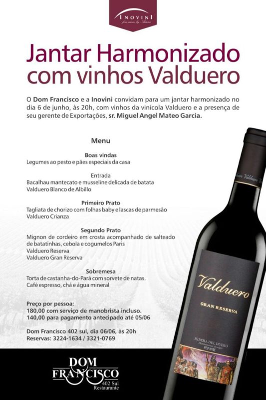 Galera de Brasília, anote: no próximo dia 6, terça-feira, estará em Brasília o gerente de exportações da Bodega espanhola Valduero para apresentar ao público brasiliense os rótulos da vinícola. Na hora do almoço se reunirá com jornalistas da cidade e à noite participará de um jantar harmonizado para público pagante, ambos os encontros acontecerão no restaurante Dom Francisco da 402 Sul. Serão servidos, em ambas ocasiões os vinhos tintos Crianza, Reserva e Gran Reserva e o vinho branco Valduero blanco de Albilio.