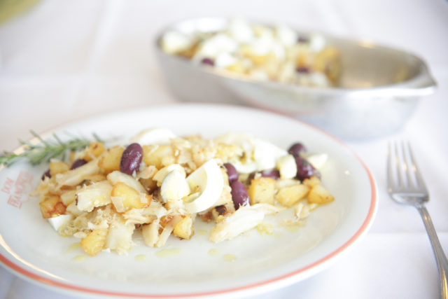 Bacalhau à Gomes de Sá, com arroz de brócolis (R$110), feito na panela em fundo de azeite, cebolas douradas, batatas em cubos fritas, azeitonas e ovos cozidos, serve duas pessoas. Há ainda o Prime Steak (R$59), com farofa de ovos, que serve uma pessoa, e o Prime Rib (R$98), também com farofa de ovos, que serve de uma a duas pessoas