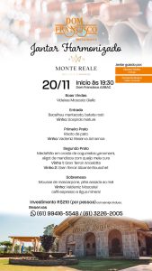 Com o evento, o Dom Francisco oferece aos apreciadores de boa gastronomia e vinhos a oportunidade de explorar o que há de melhor nos sabores e aromas da Monte Reale, em uma noite que promete unir o requinte da culinária brasileira à tradição vinícola italiana.