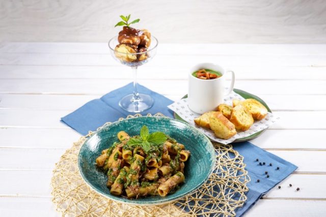Entrada: Creme de ervilhas com bacon. Principal: Rigatoni com ragu de cordeiro e chimichurri de hortelã. Sobremesa: Profiteroles com calda quente de chocolate. R$ 89,00.