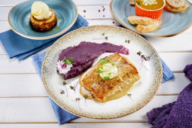 Entrada: Caldinho de abóbora com queijo gorgonzola. Principal: Filé de robalo ao molho de champanhe purê de batata roxa e manteiga de laranja. Sobremesa: Cocada de forno com sorvete de tapioca. R$ 89,00.