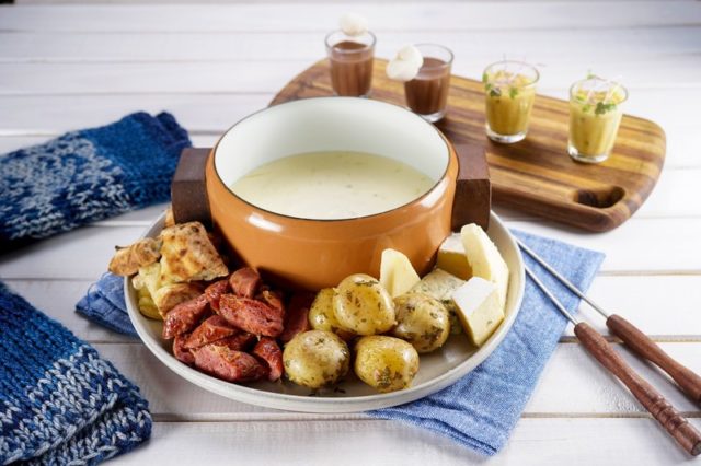 Entrada: Amuse bouche de batata baroa com frango. Principal: Fondue de queijo (com focaccia Rosemary, batata bolinha, linguiça e queijo). Sobremesa: Chocolate quente com marshmallow baby. R$ 99,00.