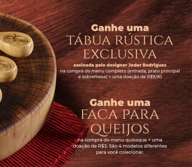 Na compra do menu completo mais a doação de R$ 9,90, o brinde é uma tábua rústica de eucalipto hidratada com óleo mineral e finalizada com cera de abelha assinada pelo designer Jader Rodrigues, do @studiojaderrodrigues. Ao comprar o menu quiosque, com mais R$ 3,00 será oferecida uma unidade de faca de queijo colecionável. São quatro opções diferentes.