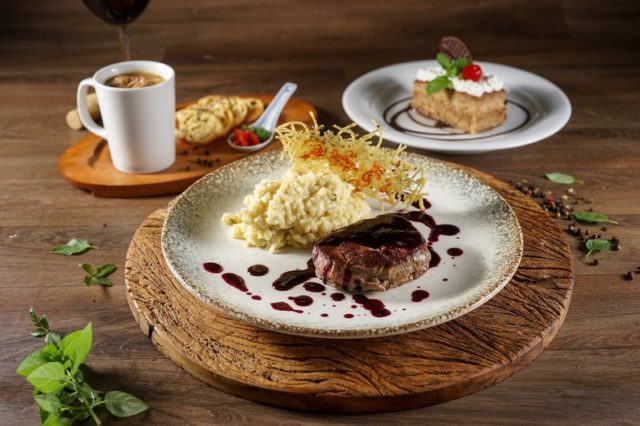– Principal: filé ao molho de Vinho do Porto com risoto de Grana Padano;