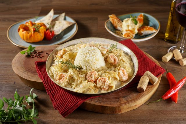 – Principal: camarões flambados ao molho de queijo brie gratinado com maçã;