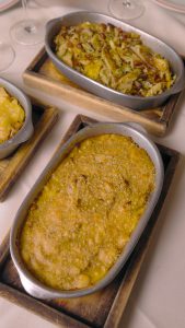 Entre as opções do festival está o bacalhau servido sobre purê de mangarito do Cerrado, finalizado com farofa crocante de panko e baru e um leve toque de pimenta de macaco. Outra receita combina lascas de bacalhau assadas com maçãs e temperos da casa, cobertas por musseline de mandioca gratinada com parmesão.