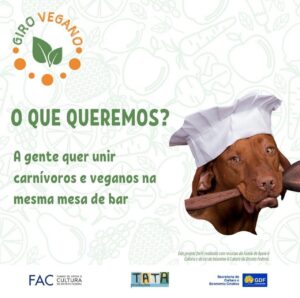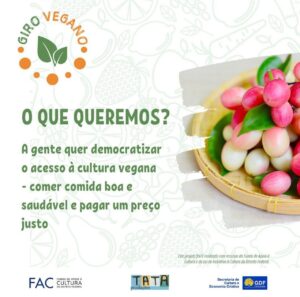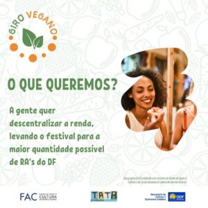 O Iº Festival Giro Vegano é realizado com recursos do Fundo de Apoio à Cultura do Distrito Federal (FAC-DF) e se encerrará com uma tarde de feirinha de produtos veganos, bar, música e degustações.