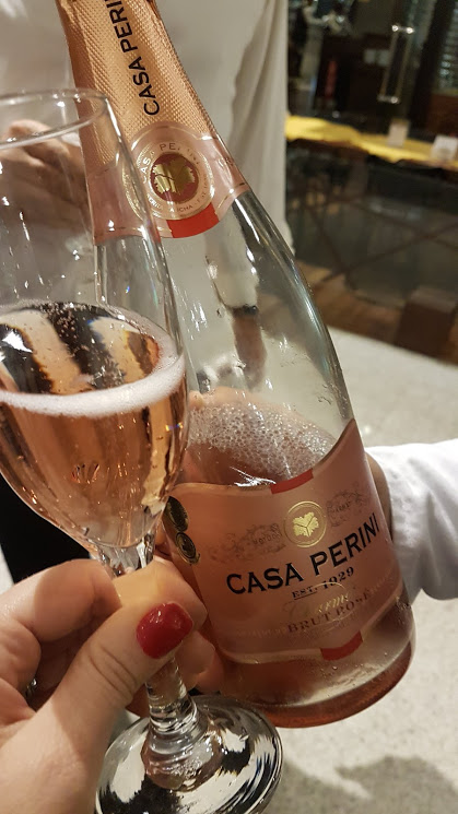 O primeiro é um espumante Brut Rosé da Casa Perini, vinícola brasileira, produzido com as castas Chardonnay, Gamay e Pinot Noir. Apresentou com aromas frutados e delicados. Espumante bem fresco e agradável.