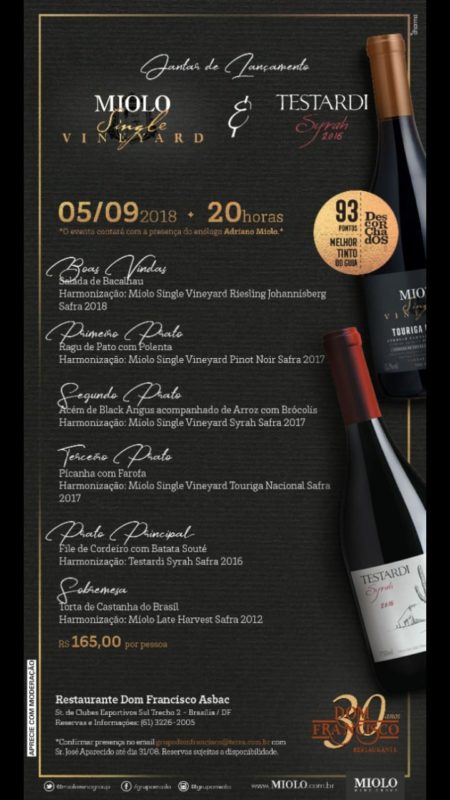 Anote para não perder: dia 5 de setembro haverá lançamento oficial da linha Miolo Single Vineyard no restaurante Dom Francisco, Asbac – em Brasília. O próprio Adriano Miolo, enólogo e superintendente da vinícola que leva o seu sobrenome, estará na cidade para apresentar os vinhos, que são provenientes de um único vinhedo. Na ocasião também haverá lançamento do Syrah Testardi 2016, produzido no Vale do São Francisco-BA. Confira o menu: