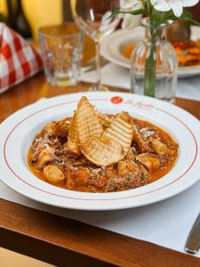Na cozinha, o chef Tiago Santos conduz um cardápio de inspiração francesa, com pratos que ajudam a marcar a identidade do bistrot, como magret de pato (R$115,00), gnocchi de batata-baroa com ragú de carne (R$83,00) e cordeiro braseado com galete de banana e molho roti (R$109,00)