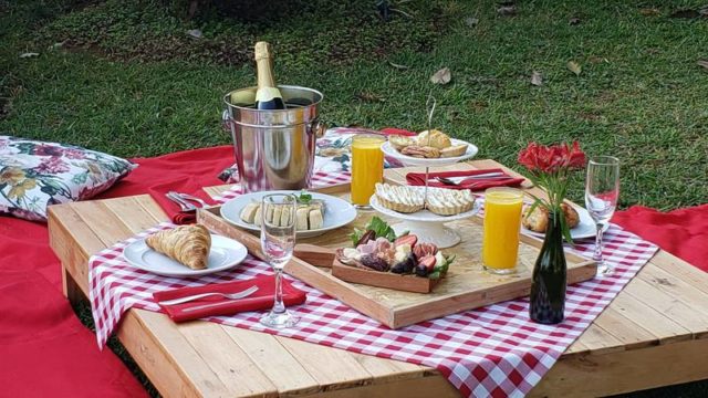 A “Experiência piquenique no Le Jardin Bistrot” conta com duas versões que já incluem a montagem dos paletes, as toalhas e as almofadas coloridas: o kit Paris e o Kit Saint-Tropez. O primeiro custa R$ 194,00 para duas pessoas e é recheado de delícias como croissants, paniers, quiches e tarteles, além de sucos e café. O segundo, também para duas pessoas, custa R$ 279,00 e tem como grande diferencial o espumante nacional Fabian Brut Branco ou Rosé. Além disso, vem com uma saborosa tábua de frios, uma porção de rilete de porco, mini quiches e muitas outras gostosuras. Caso haja interesse, outros itens também podem ser adquiridos no dia para complementar os kits, como sucos, vinhos, refrigerantes etc.