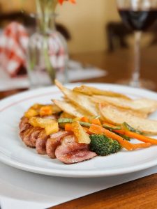 O cardápio reúne pratos que traduzem a essência dos tradicionais bistrôs franceses, com receitas que valorizam preparos clássicos e combinações contemporâneas. Entre os destaques estão o Boeuf bourguignon, o Magret de pato, a costeleta de cordeiro e opções que exploram diferentes cortes e acompanhamentos, sempre com atenção à técnica, ao sabor e à apresentação.