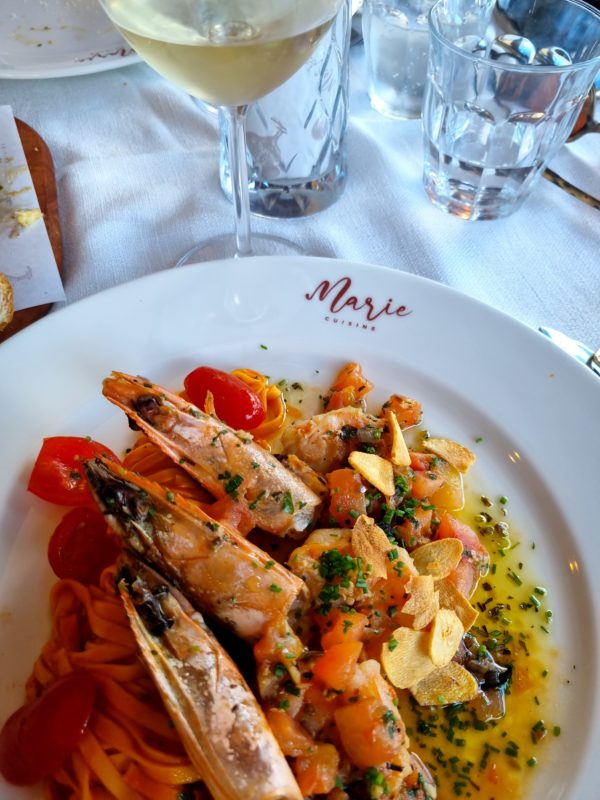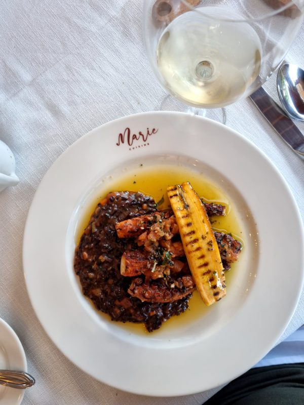 Como em grande parte dos restaurantes da cidade, a carta do Marie também é composta exclusivamente por rótulos da importadora Del Maipo. São vinhos provenientes da França, Itália, Espanha, Portugal, Hungria, Uruguai, Argentina, Chile e do Brasil. Os vinhos franceses dominam a carta, especialmente os de Bordeaux. Também há uma certa variedade de bons vinhos italianos da região do Piemonte. Para harmonizar com os pratos que pedi, elegi o Sensi 1890 Collezione Pinot Grigio de boa relação preçoxqualidade (R$135).