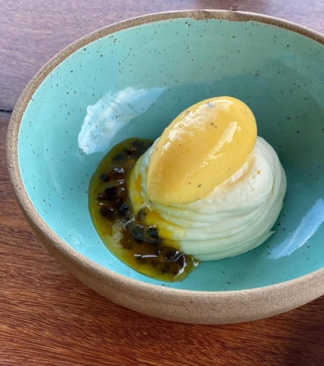 9) Sopa de chocolate branco com calda e sorvete de maracujá (Rocka)
