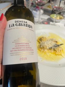 O terceiro rótulo, Dehesa La Granja Vino de la Tierra de Castilla y León 2018, trouxe à mesa a essência das vinhas centenárias da região. Este vinho apresenta um perfil aromático profundo, com notas de frutas escuras, tabaco e especiarias. Na boca, é encorpado e bem estruturado, com taninos firmes e um final persistente. Uma escolha ideal para pratos mais robustos, como carnes de caça e pratos à base de cogumelos.