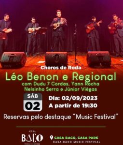 No sábado (02/09), para fechar a semana Léo Benon e Regional que apresentarão o show “Choros de Roda”. O espetáculo, fruto do álbum musical autoral homônimo lançado em 2022, também abarcará composições de seu primeiro álbum, lançado em 2013, e choros de Waldir Azevedo, mestre-mor do cavaquinho brasileiro que teria completado 100 anos em janeiro. Em nova formação, o Regional do cavaquinista Léo Benon é composto por Dudu 7 Cordas (violão de 7 Cordas), Yann Rocha (violão), Nelsinho Serra (cavaquinho centro) e Júnior Viégas (pandeiro). O show propõe uma viagem ao universo musical de Léo Benon por meio de suas composições, da celebração do centenário de Waldir Azevedo e releituras de choros tocados nos quintais, regados à tradição com pitadas de respeitosas experimentações.