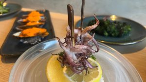 A principal novidade é a inauguração do ambiente, que passa a operar com foco em petiscos e robatas, os tradicionais espetinhos grelhados na brasa. O espaço conta ainda com um bar exclusivo de coquetelaria. No cardápio, a proposta reúne opções que vão de clássicos da culinária japonesa, como takoyaki com polvo, tamagoyaki trufado e edamame grelhado, a versões mais elaboradas de robatas, com ingredientes como shiitake, pancetta, chorizo e wagyu. Entre os frutos do mar, destaque para a vieira com salmão e o polvo ao curry.