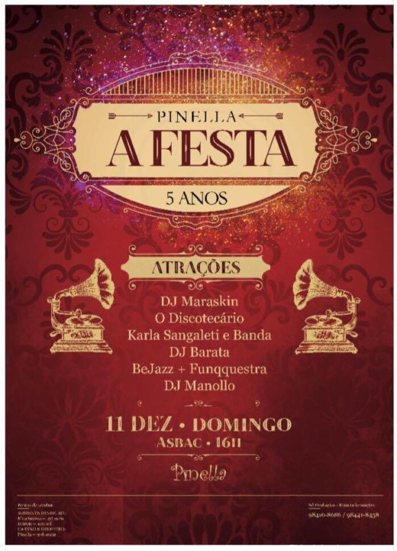 Os apaixonados pelo Pinella já podem comemorar! Em dezembro, o bar completa 5 anos e vai fazer uma festa especial para celebrar. Tudo o que você mais ama no Pinella, reunido em um só dia, em um só lugar! A balada vai ser na ASBAC, no espaço Varanda Tropical, domingo, 11 de dezembro, às 16h.