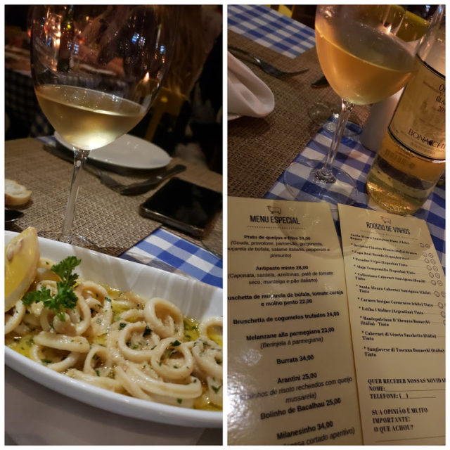 Adorei o Orvieto Classico Bianco com as lulas ao limão (R$34) e com o Arancini! Esse vinho é ótimo para iniciar os trabalhos! Vinho fresco com aromas cítricos, boa acidez, corpo leve e boa persistência.