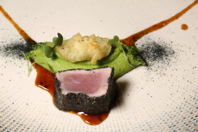 Atum nikkei com purê de ervilha e tempurá de quiabo molho de Rapadura (Harmonizado com Santa Rita Secret Reserve Pinot Noir)
