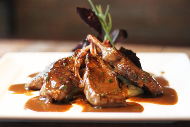 – Prato principal: Carré de cordeiro na redução de conhaque e trufas, guarnecido de batata gratinada;