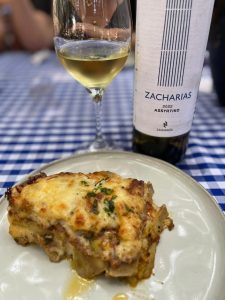 Para harmonizar com essa experiência, optamos pelo vinho Zacharias, um rótulo feito da uva Assyrtiko, originária da Grécia. Mineral e refrescante, o vinho complementou perfeitamente o ambiente e ajudou a aliviar o calor.