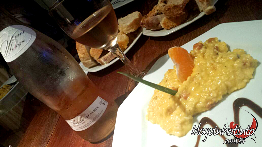 Harmonização – Não houve rigidez com a harmonização durante a noite, mas todos foram unânimes em combinar o delicioso prato principal – risoto de tangerina com bacon e queijo gouda – com uma taça do maravilhoso rosé de Provence Vaint Vidoine. Também harmonizei o risoto com o delicioso e intenso “Irmãos Rosé” do Douro e ficou sensacional. O menu foi preparado por César Santos, um dos organizadores do evento Brinda Brasil, que se revelou um excelente Chef de cozinha.