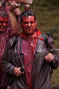 Durante o evento, os participantes vestem roupas brancas, complementadas pelo clássico lenço vermelho, um símbolo que remete às festas populares espanholas. As “armas” usadas na batalha são baldes, pistolas d’água adaptadas para jorrar vinho, garrafas e mochilas pulverizadoras, numa brincadeira regada a até 50 mil litros de vinho tinto — vinho de baixa qualidade ou que não é mais destinado à venda, fornecido pela prefeitura local. O líquido derramado é absorvido pela terra ou lavado pela chuva, mantendo o respeito pelo meio ambiente.