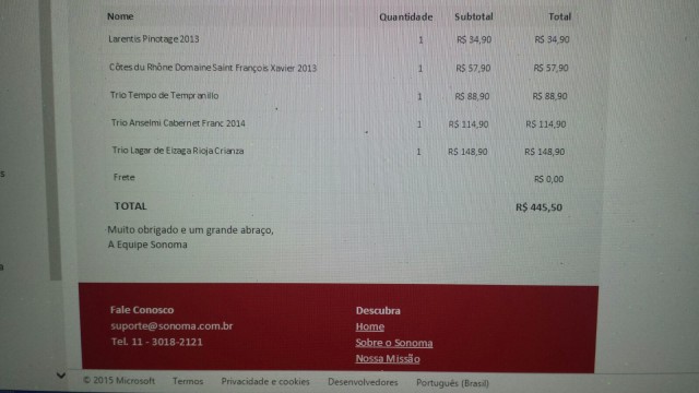 Hoje, 29, é o último dia da Black Friday do Sonoma, um dos maiores e-commerces de vinho do Brasil. Os vinhos disponíves foram escolhidos a dedo pela equipe de curadores e sommeliers – com até 50% de desconto. Tinha tanta coisa boa e com preços tão bons que eu também não resisti. Por exemplo, comprei três espanhóis Crianza Lagar de Eizaga por apenas R$148,00 (o preço normal seria R$330,00), um Côtes du Rhône Domaine Saint François Xavier por apenas R$57,90 (preço normal é de R$115,00) e três italianos Anselmi Cabernet Franc por R$114,90 (cujo preço fora da promoção seria de R$195). Bem, pra falar a verdade comprei mais algumas coisinhas (11 vinhos ao todo) e minha conta deu R$445,00, com frete grátis. Ainda parcelei em três vezes. Bom demais, né?