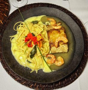 No Villa Tevere, os vinhos podem harmonizar com entradas como choux recheados com creme de camarões ou caponata de berinjela. Entre os principais, há opções como gnocchi com tiras de alcatra e cogumelos, risotos de abobrinha com camarões ou de abóbora com amêndoas, além de pratos como baby beef com risoto de tomate seco e pescada ao molho de camarões. As sobremesas incluem torta de chocolate com caramelo salgado e panna cotta com geleia de frutas vermelhas.