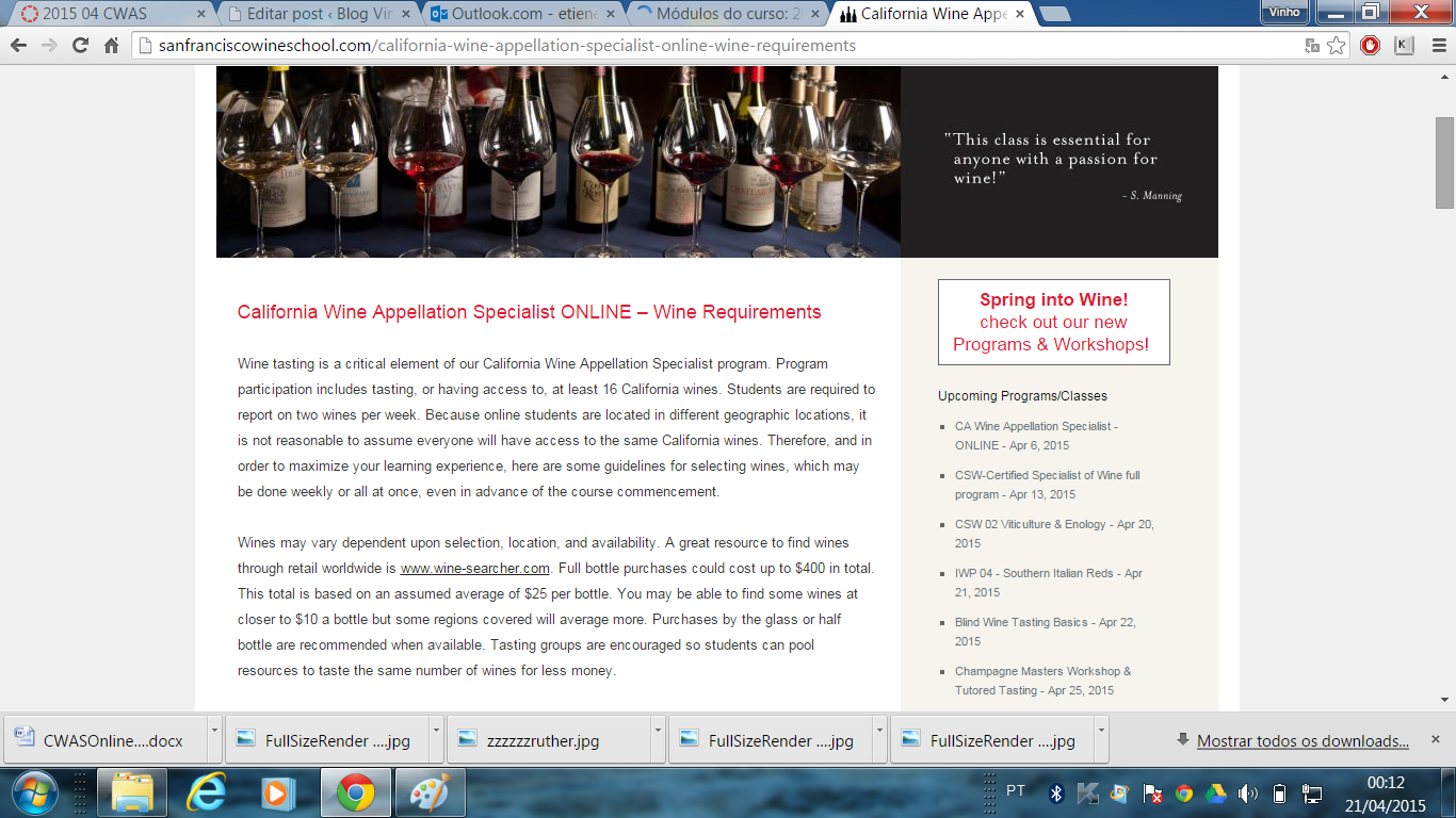 O Californian Wine Apellation Specialist -CWAS® é realizado presencialmente e também está disponível na versão on-line. Como o curso presencial já havia começado antes mesmo de eu chegar aqui na Califórnia, me matriculei na versão virtual, o que está sendo ótimo por duas razões importantes: a primeira, porque como meu inglês é intermediário, conto com a ajuda do google tradutor e de dicionários para realizar os exercícios; a segunda é justamente porque pelo fato de o curso ser em inglês (inclusive as aulas gravadas) isso acaba me forçando a me familiarizar com o idioma, principalmente, com o inglês técnico, algo de extrema importância para quem atua na área ou para quem escreve sobre vinhos, como é meu caso. (Não vou negar que é um desafio, mas é bem interessante!)