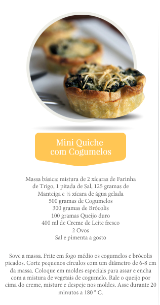 Petiscos finos são ideais para a noite. Mini quiches podem ser degustados enquanto a conversa vai rolando. Confira a receita: